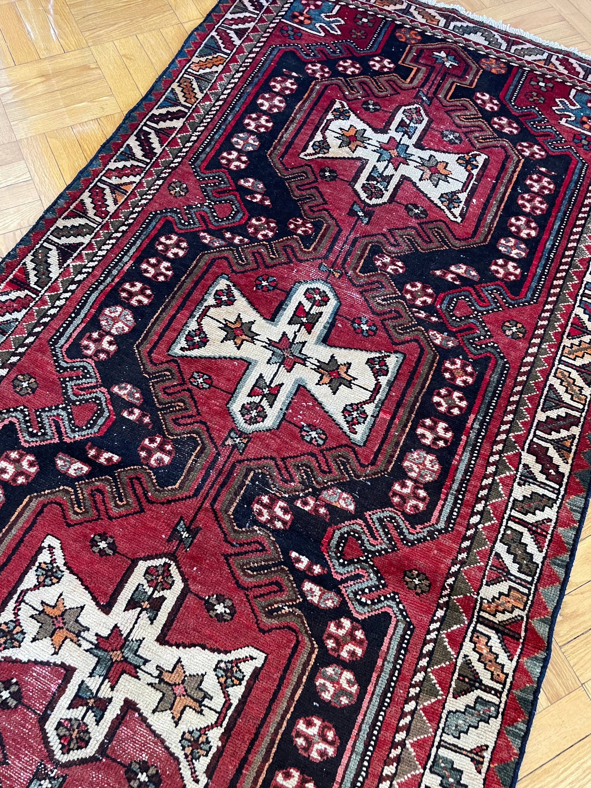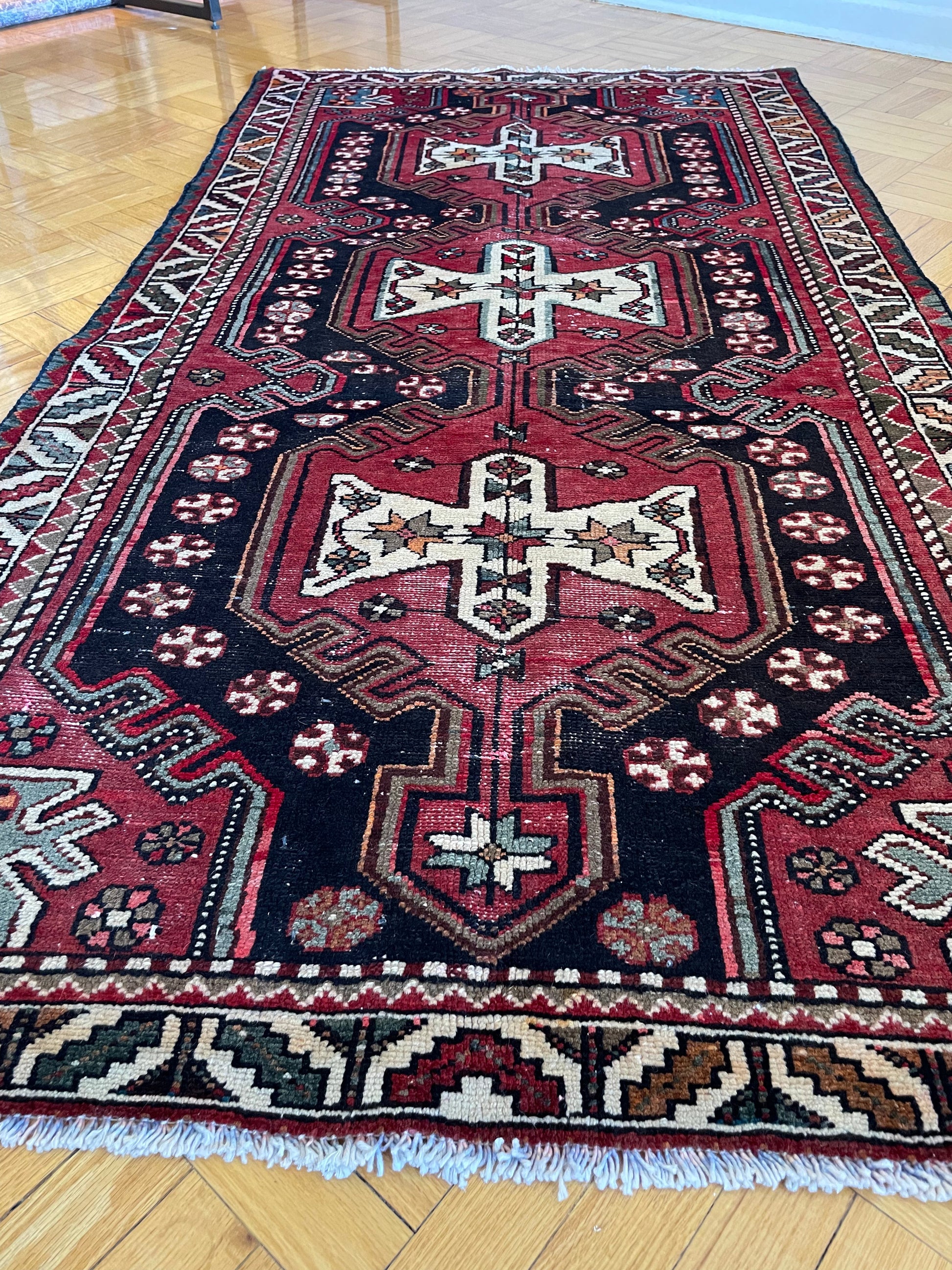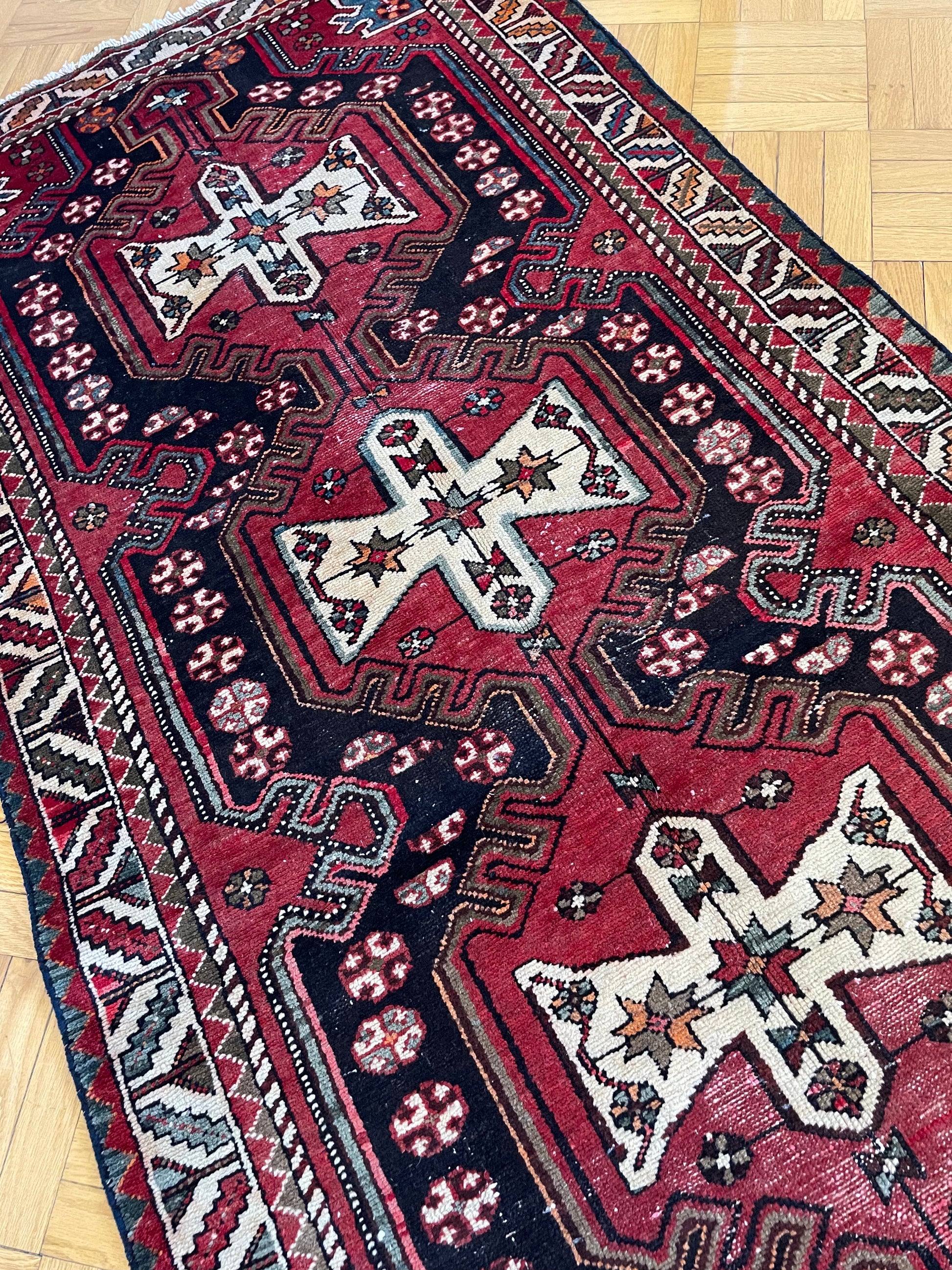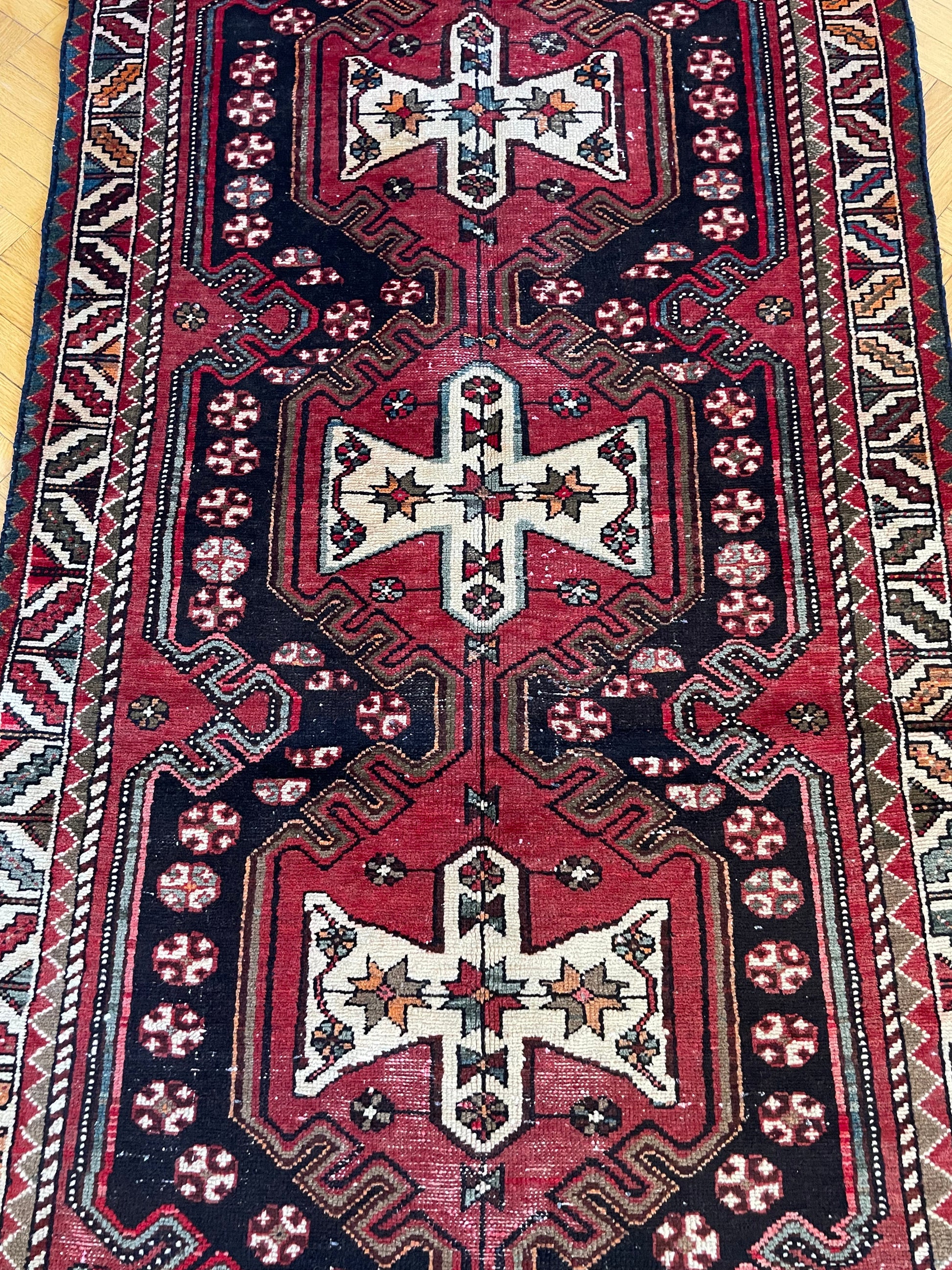 Beautiful Vintage 7' 2" x 3' 7" ft. Geometric Persian area rug. Hand-Knotted Soft Wool Persian Carpet In good Condition